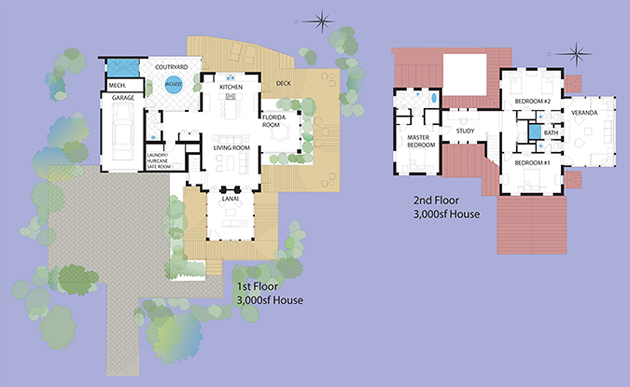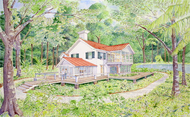 In order to preserve the tropical character of the 3 ½-acre oak hammock site, we collaborated with our engineer to create an innovative site design that would preserve the mature trees. The site plan calls for tree wells to protect trees, elevated walkways, native vegetation and because there is no grass, a minimal/temporary irrigation system.