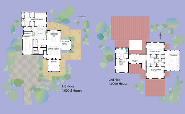 Flexibility is the predominant design feature of the lakefront 2,400 s.f.-3,750 s.f. “Florida cottages.” Elements such as the front porch, master cottage and Florida room can be added over time to meet a client’s needs and budget.