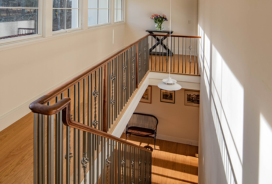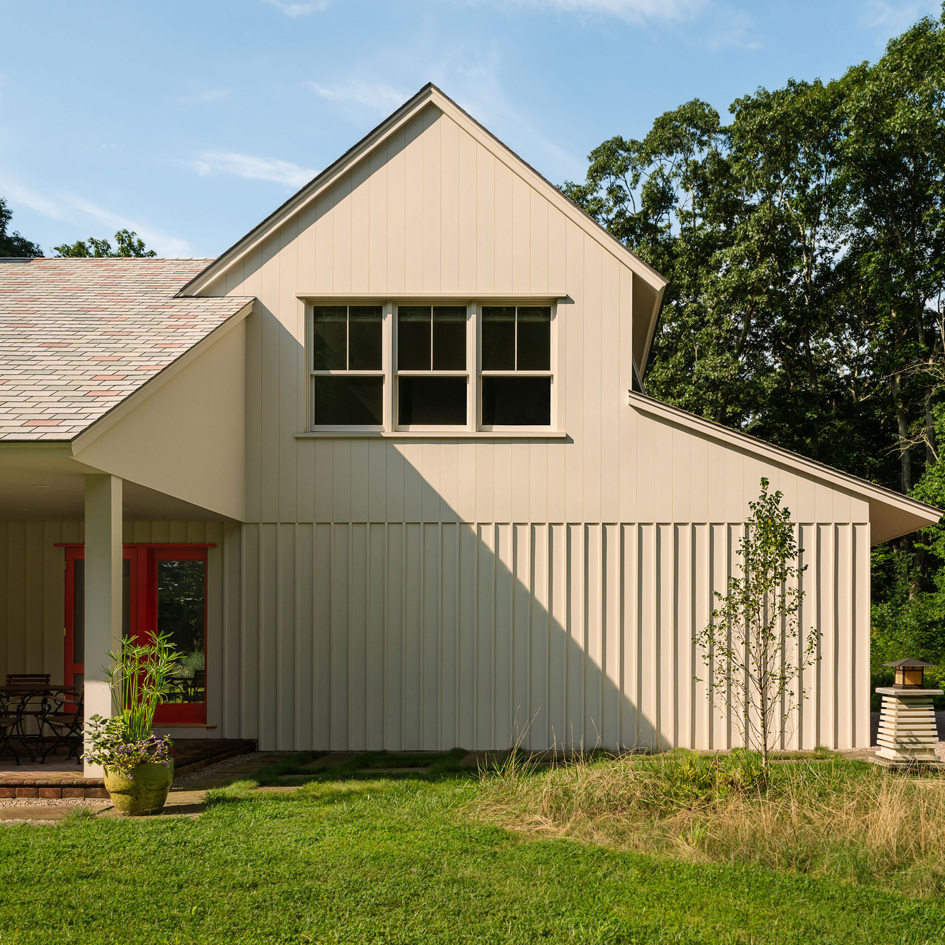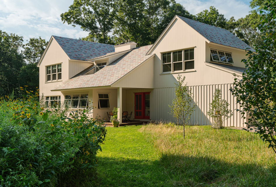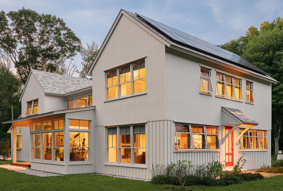 A twist of fate presented Architect Michael McKinley a once in a lifetime opportunity. When a roof fire destroyed his family home in 2017, he turned the tragedy into an opportunity to completely reimagine the house in terms of the architecture of the future. Sustainability was achieved by use of building materials that are recycled, maintenance free, and fireproof. Geothermal heating and cooling, solar panels, on demand hot water and natural daylighting with large windows on the south side of the house not only eliminate fossil fuel but also generate electricity into the grid. Rather than rebuild a replica of the original Shingle Style home, the new design was inspired by nearby historic farms and incorporates the spirit of a farmhouse. The efficient 3,200 s.f. residence has four bedrooms, three full bathrooms, a very social kitchen and light filled conservatory that functions as a dining room, library and a screened-in porch