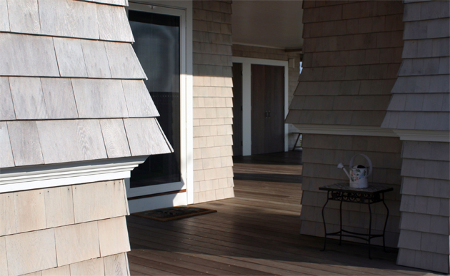 - Flared columns, Ipe decking and a board ceiling are central design elements of this ground floor outdoor living space.